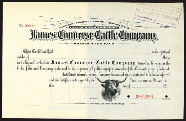 Wyoming, 189x. Specimen Stock Certificate, Odd Shares, Black without border, Steer on bottom, ornate title on top, Converse Cattle had 40,000 head of cattle in its herd in the 1880-90's. Specimen overprint, POC's, ABNC.