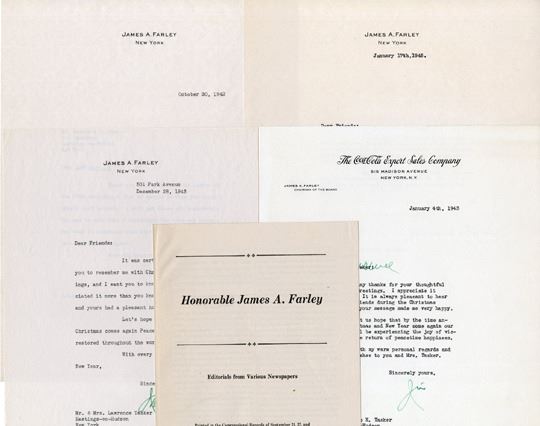 New York, 1942-45. Letters signed by James Farley on personal letterhead and 1 letter on Coca-Cola letterhead. James Aloysius Farley (May 30, 1888 – June 9, 1976) was an American politician and Knight of Malta who simultaneously served as chairman of the New York State Democratic Committee, chairman of the Democratic National Committee, and Postmaster General under President Franklin Roosevelt. After leaving Washington in 1940, Farley was named chairman of the board of the Coca-Cola Export Corporation, a vehicle that was created for his talents. Farley held this post until his retirement in 1973. Farley defeated a Roosevelt bid to name the party's candidate for New York governor in 1942. Farley once again became an important national political force when his old friend, Harry Truman, became president in 1945. Also included in lot is a pamphlet of Editorials from various newspapers by the Honorable James A. Farley. (5).