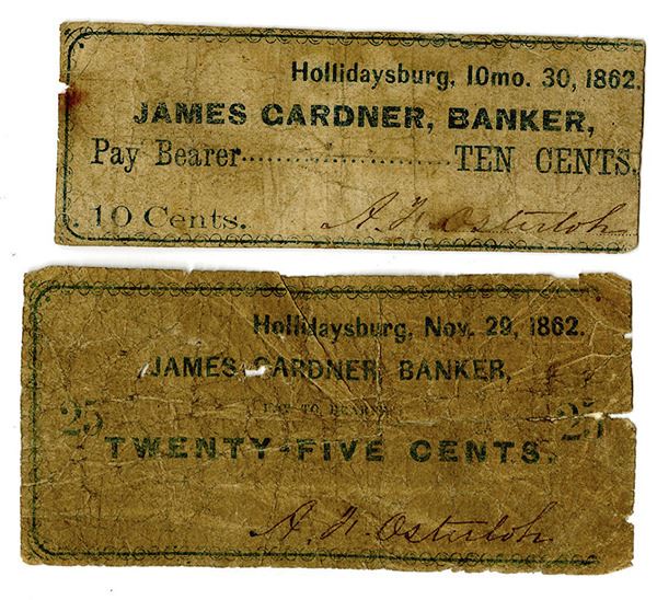 Hollidaysburg, Pennsylvania, Lot of 2 notes, Includes 10 cents, Issued, H 159-43, VG with toned paper; and 25 cents, Issued, H 159-44A Unlisted, VG with right border rough with small tears, Both with plain design and printed in dark green-blue, Rare notes in any condition with the 25 cents note unlisted in Hoober. We could not find any recent auction appearances for this scarce scrip note pair.