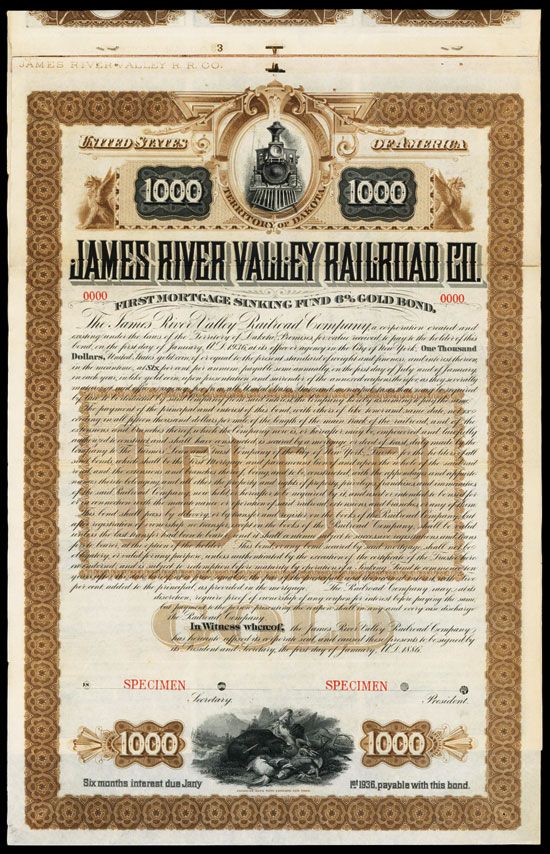 Dakota, 1886, $1000, 1st Mortgage Sinking Fund 6% Gold Specimen Bond, Coupons attached, Black on brown border and underprint, Moving locomotive by telegraph lines top center with black bear attacking horse and Indian bottom center, Red SPECIMEN overprints POC's and red s/n Ò0000Ó, VF condition, ABNC.