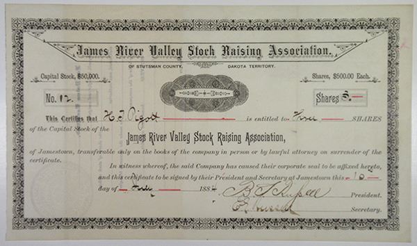 Jamestown, Stutsman County, Dakota TerritoryĆ’.. 1884. 3 Shares, I/U Stock Certificate, No vignette, ornate printing, S/N 12, VF condition.