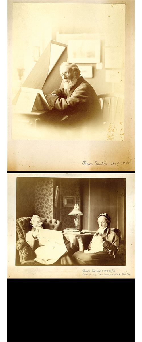 Lot of 2 photographs mounted on thin cardboard, back to back. ND (ca. 1880's), 13 x 10.5 inches, one image showing Smillie reading while sitting with his wife who is knitting, the second image is a portrait of Smillie sitting at his desk studying a drawing. The photographs are in VF to XF condition but the mounting card has toning and foxing at edges and is separating on the edge. Rare photographs of this legendary artist and Landscape engraver and father of James D. Smillie and uncle of GFC Smillie.