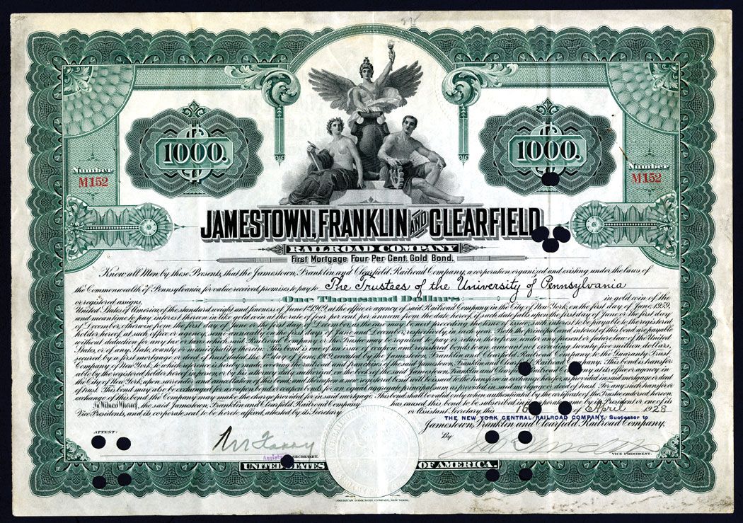 Pennsylvania, 1928, Jamestown, Franklin & Clearfield Railroad Co. First Mortgage, $1000, 4%, Gold Bond Certificate, VF Condition.