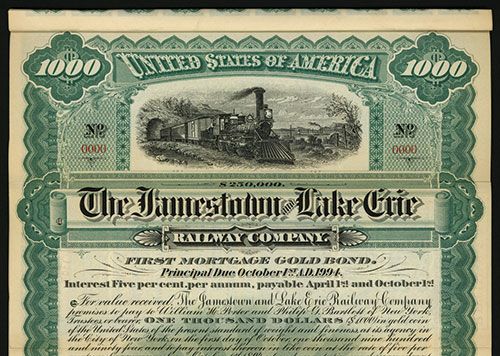 1894, $1,000. 5% 1st Mortgage Gold Bond. Green border with locomotive leaving tunnel. ABNC. Specimen w/ coupons, XF. Rare Railroad.