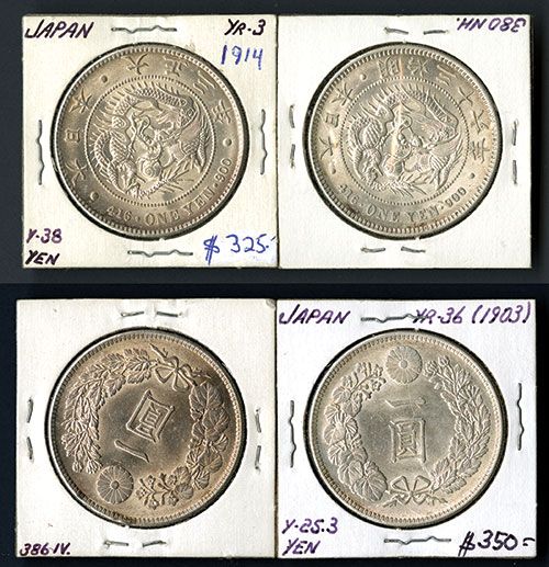 Lot of 2 coins, Includes 1 Yen, Yr-36 (1903), Y-25.3, Choice Uncirculated; and, Yr-3 (1914), Y-38, CU Condition, attractive and high grade pair of coins.