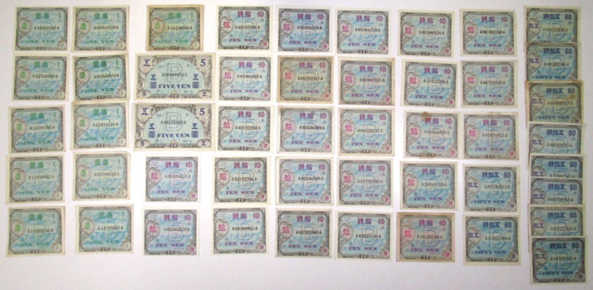 Japan...., ca.1945-46. Lot of 45+ Issued Banknotes, Includes: ND (1945), 10 Sen, P-63 (25); ND (1946), 50 Sen, P-64 (10); ND (1946), 1 Yen, P-66 (7); ND (1945), 1 Yen, P-67 (4); ND (1945), 5 Yen, P-69b (2). Notes range from VF to AU condition. (48). Sold "AS IS" no returns accepted.