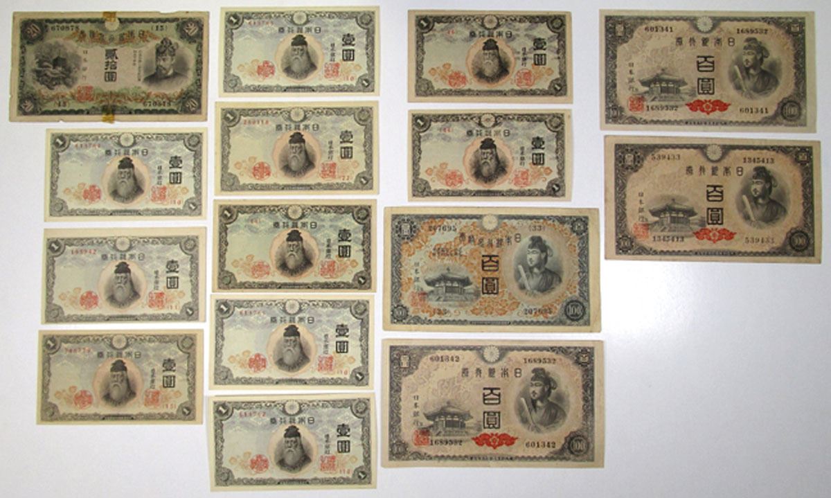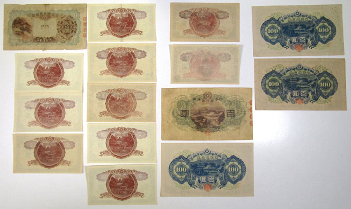 Japan, ND (1930) to ND (1944). Lot of 15 Issued Banknotes, Includes: ND (1931); 20 Yen, P-41a; ND (1930), 100 Yen, P-42a; ND (1943), 1 Yen, P-49a (8); ND (1944), 1 Yen, P-54a (2); ND (1944), 100 Yen, P-57b (3). Notes range from VF to XF condition. (15). Sold "AS IS" no returns accepted.