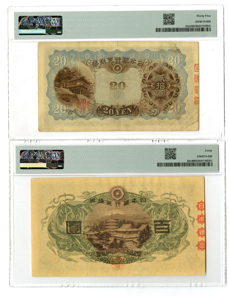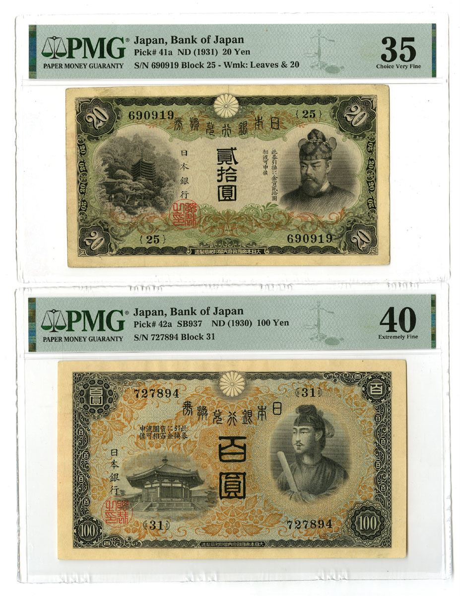 Japan, ND (1931.) and ND (1931). Lot of 2 Issued Banknotes, Includes: ND (1931) 20 Yen, P-41a, S/N 690919 Block 25, PMG graded Choice Very Fine 35; ND (1930) 100 Yen, P-42a SB937, S/N 727894 Block 31, PMG graded Extremely Fine 40. (2). Sold "AS IS" no returns accepted.
