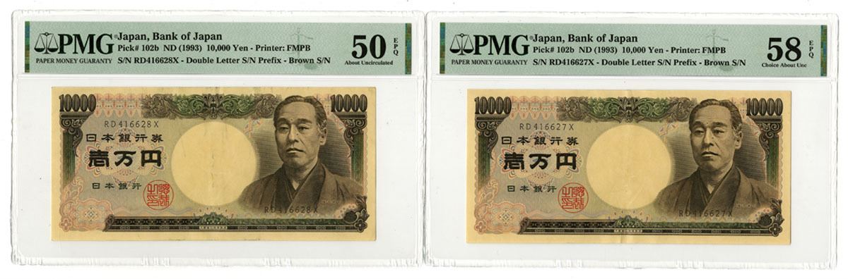 Japan, ND (1993). 10,000 Yen, P-102b (2), Sequential Pair of Issued Banknotes, Light brown on m/c underprint with Yukichi Fukuzawa at right, Back is m/c with pheasants at left and right, S/Ns RD416627X & RD416628X, Notes are PMG graded Choice About Unc 58EPQ & About Uncirculated 50 EPQ. (2). Sold "AS IS" no returns accepted.