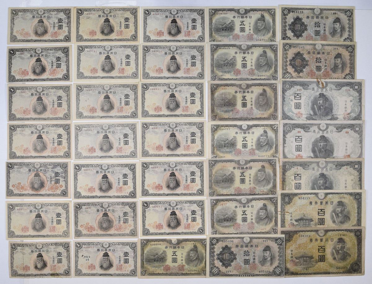 Japan...., ND (1943) to ND (1946). Lot of 35 Issued Banknotes, Includes: ND (1943), 1 Yen, P-49a (20); ND (1943), 5 Yen, P-50a (7); ND (1943), 10 Yen, P-51a (3); ND (1944), 100 Yen, P-57a (2); ND (1946), 100 Yen, P-80 (3). Notes range from Fine to AU condition or better. (35). Sold "AS IS" no returns accepted.