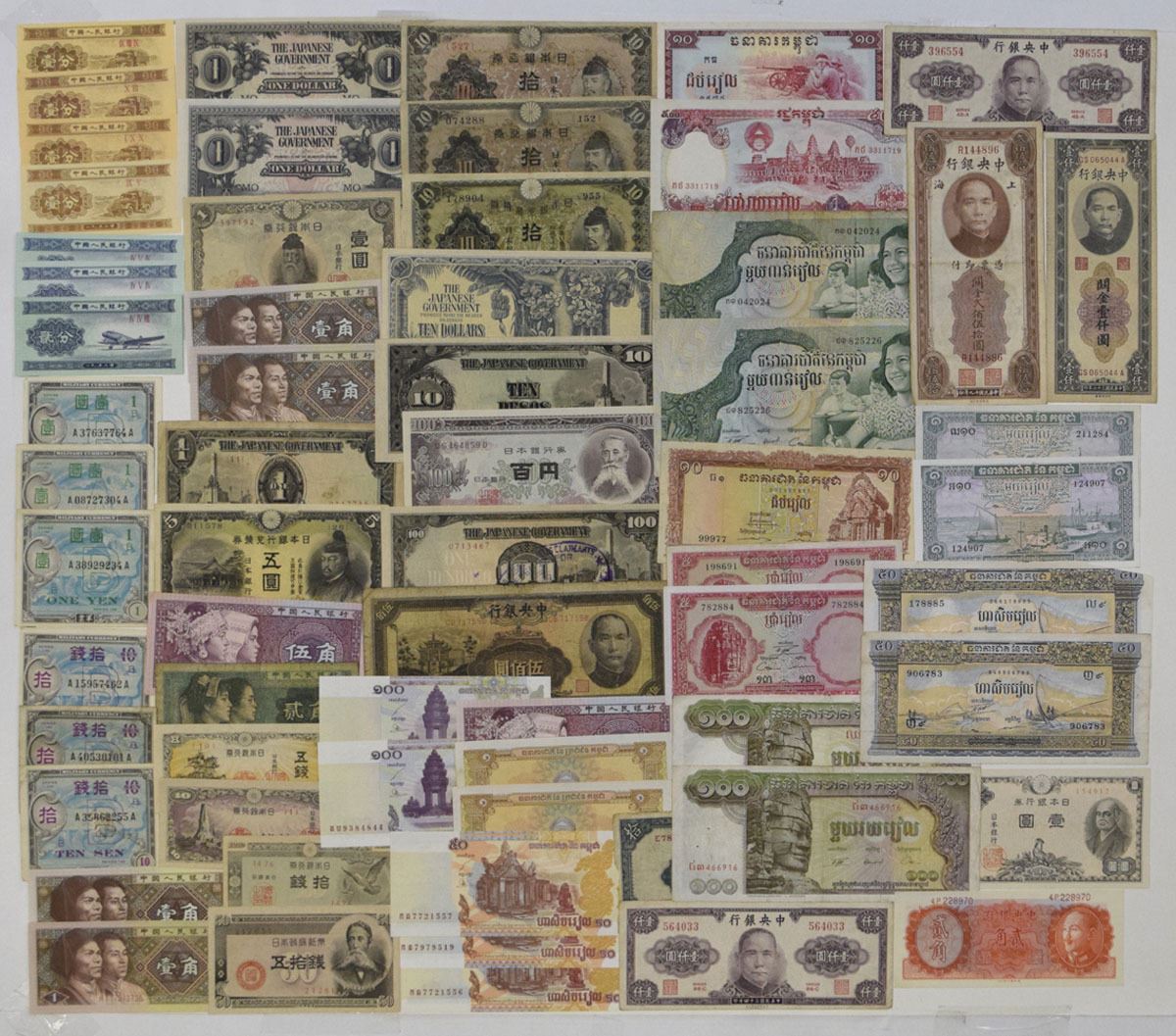 Japan, China and Asia, ND (1930)-1980. Lot of 63 Issued Banknotes, Includes: Great Imperial Japanese Government, ND (1943), 1 Yen, P-49a; ND (1943-44), P-51a & P-51b; ND (1944), 5 Sen, P-52a; ND (1944), 10 Sen, P-53a; WWII Japanese Occupation of the Philippines, ND (1943) 1 Peso, P-109a; ND (1943), 10 Pesos, P-111a; ND (1944), 100 Pesos, P-112a; WWII Japanese Occupation of Malaya, ND (1942), 1 Dollar, P-M5c (2); ND (1942), 10 Dollars, P-M7b; Bank of Japan, ND (1930), 10 Yen, P-40a; ND (1942), 5 Yen, P-43a; ND (1947), 10 Sen, P-84; ND (1946), 1 Yen, P-85a; ND (1953) 100 Yen, P-90b; Japanese Government, 1948, 50 Sen, P-61a; Central Bank of China, 1940, 10 Yuan, P-228, CHB; 1944, 500 Yuan, P-266; 1945, 1000 Yuan, P-291 (2); 1930, 250 Customs Gold Units, P-331, ABNC; 1947, 1000 Customs Gold Units, P-339c; 1946, 20 Cents, P-395A, TDLR; Allied Military Currency - WWII ND (1945), 10 Sen, P-63 (3); ND (1946), 1 Yen, P-66; ND (1945), 1 Yen, P-67 (2); National Bank of Cambodia, ND (1956-75), 1 Riel, P-4 (2), BWC; ND (1956-75), 50 Riels, P-7 (2); ND (1957-75) 100 Riels, P-8 (2); ND (1962-75), 5 Riels, P-10 (2), BWC; ND (1962-75) 10 Riels, P-11, TDLR; ND (1973), 1000 Riels, P-17 (2), BWC; 2002, 50 Riels, P-52 (3); 2001, 100 Riels, P-53a (2); Bank of Kampuchea, 1975, 10 Riels, P-22a; State Bank of Democratic Kampuchea, 1979, 1 Riel, P-28a (2); Peoples National Bank of Cambodia, 1991, 500 Riels, P-38a; Peoples Bank of China, 1953, 1 Fen, P-860b (2) and P-860c (2); 1953, 2 Fen, P-861b (3); 1980, 1 Jiao, P-881a (4); 1980, 2 Jiao, P-882a; 1980, 5 Jiao, P-883a (2). Notes range from Fine to CU condition. (63). Sold "AS IS" no returns accepted.