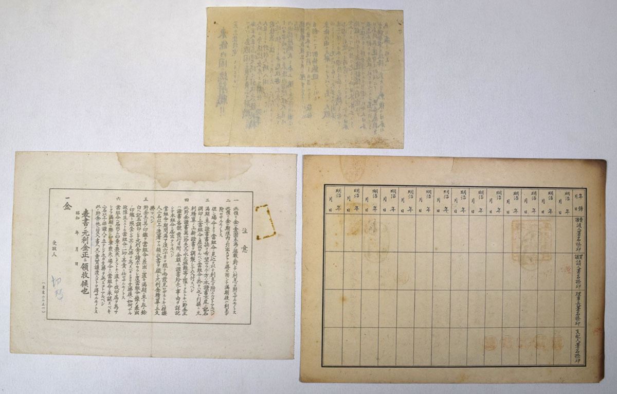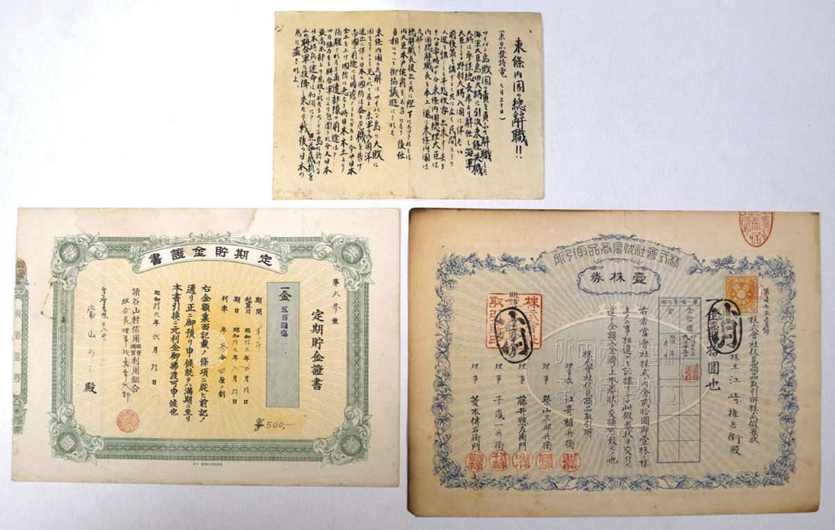 Japan...., ND (1920-44). Lot of 3 Japanese Certificates, consisting of documents from the early to mid-20th century, highlighted by a wartime government broadside dated July 1944 announcing the resignation of Prime Minister Hideki T_j_ and his Cabinet following the disastrous loss of Saipan. Printed on thin paper with bold headline characters “Cabinet Resignation!!,” the text explains that the Army and Navy ministers, together with T_j_ himself, had stepped down in recognition of Japan’s worsening military situation and the grave danger to the homeland. This type of public notice was distributed nationally to inform citizens of important political events, and its issuance marked a turning point in Japan’s wartime leadership. Also included is a 1928 Kobe Commodity Exchange Co., Ltd. stock certificate for one 50-yen share, ornately printed with revenue stamp and seals, and a 1934 fixed-term savings certificate for 500 yen with green decorative border. Together they illustrate the political and financial upheavals of prewar and wartime Japan. All 3 are in VF to Choice VF condition. (3).