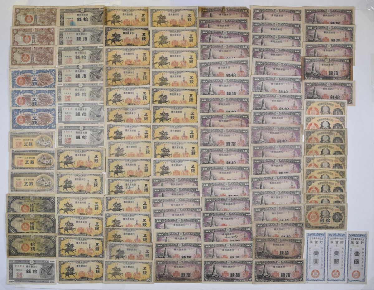 Japan, 1917-21 to ND (1948). Lot of 109 Issued Banknotes, Includes: Great Imperial Japanese Government, 1917-21, 10 Sen, P-46 (9); Bank of Japan, ND (1944), 5 Sen, P-52a (30); ND (1944), 10 Sen, P-53a (47); ND (1948), 5 Sen, P-83 (3); ND (1947), 10 Sen, P-84 (8); Japanese Military - WWII, ND (1939), 1 Sen, P-M7a (3) S/M#T30-2; ND (1940), 5 Sen, P-M9 (3) S/M#T30-3; ND (1940), 10 Sen, P-M11 (3) S/M#T30-4. Lot also Includes 1 Yen Savings Vouchers, P-Unlisted (3). Notes range from Fine to AU condition, (109). Sold "AS IS" no returns accepted.
