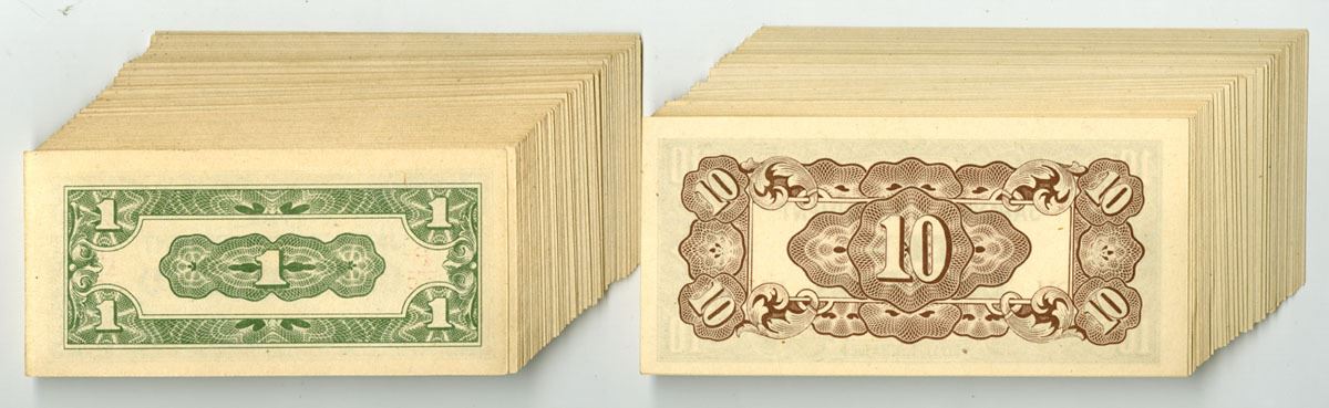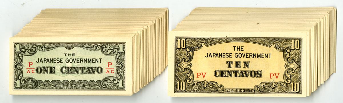 Japanese Occupation of the Philippines, ND (1942). Lot of 132 Issued Banknotes, Includes: 1 Centavo, P-104b (79), Black on green underprint; 10 Centavos, P-104a (53), Black on light, Notes are in AU to UNC condition. (132). Sold "AS IS" no returns accepted.