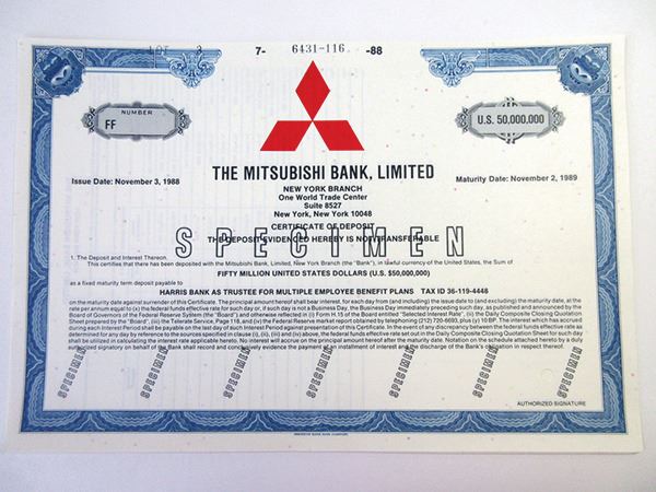 Japan. $50 Million dollar bond specimen, The Mitsubishi Bank, Ltd.Êwas a major Japanese bank that served as the main bank for theÊMitsubishiÊconglomerate. It merged withÊThe Bank of TokyoÊin 1996 to form The Bank of Tokyo-Mitsubishi (nowÊMUFG Bank). The U.S. Office of the bank was located at One World Trade Center which was destroyed in 2001. High Denomination Bonds like this are very rare. Uncirculated, ABNC.