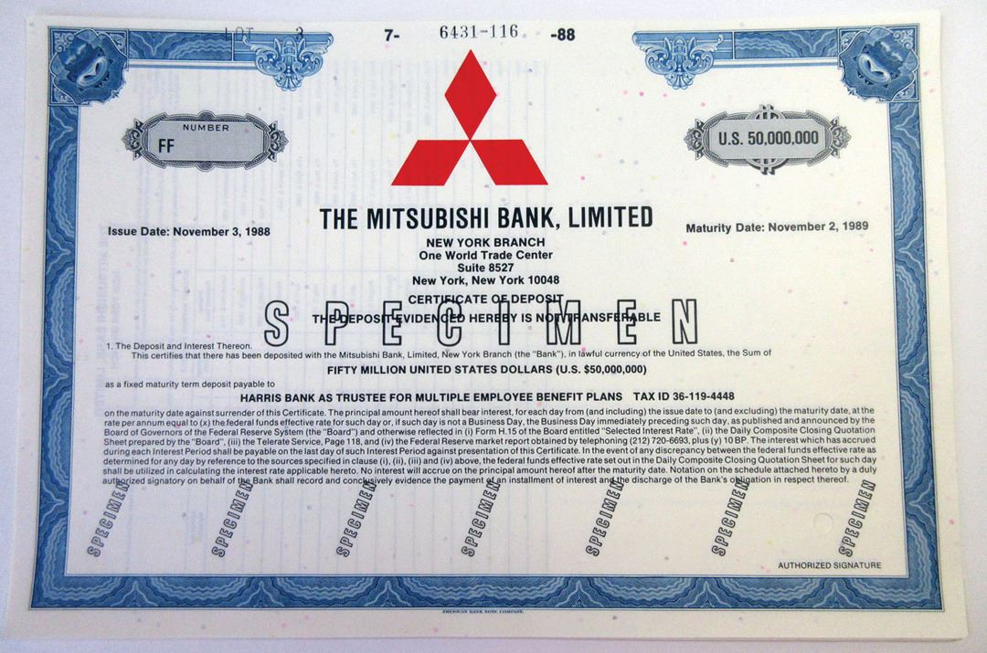 Japan. $50 Million dollar bond specimen, The Mitsubishi Bank, Ltd.æwas a major Japanese bank that served as the main bank for theæMitsubishiæconglomerate. It merged withæThe Bank of Tokyoæin 1996 to form The Bank of Tokyo-Mitsubishi (nowæMUFG Bank). The U.S. Office of the bank was located at One World Trade Center which was destroyed in 2001. High Denomination Bonds like this are very rare. Uncirculated, ABNC.