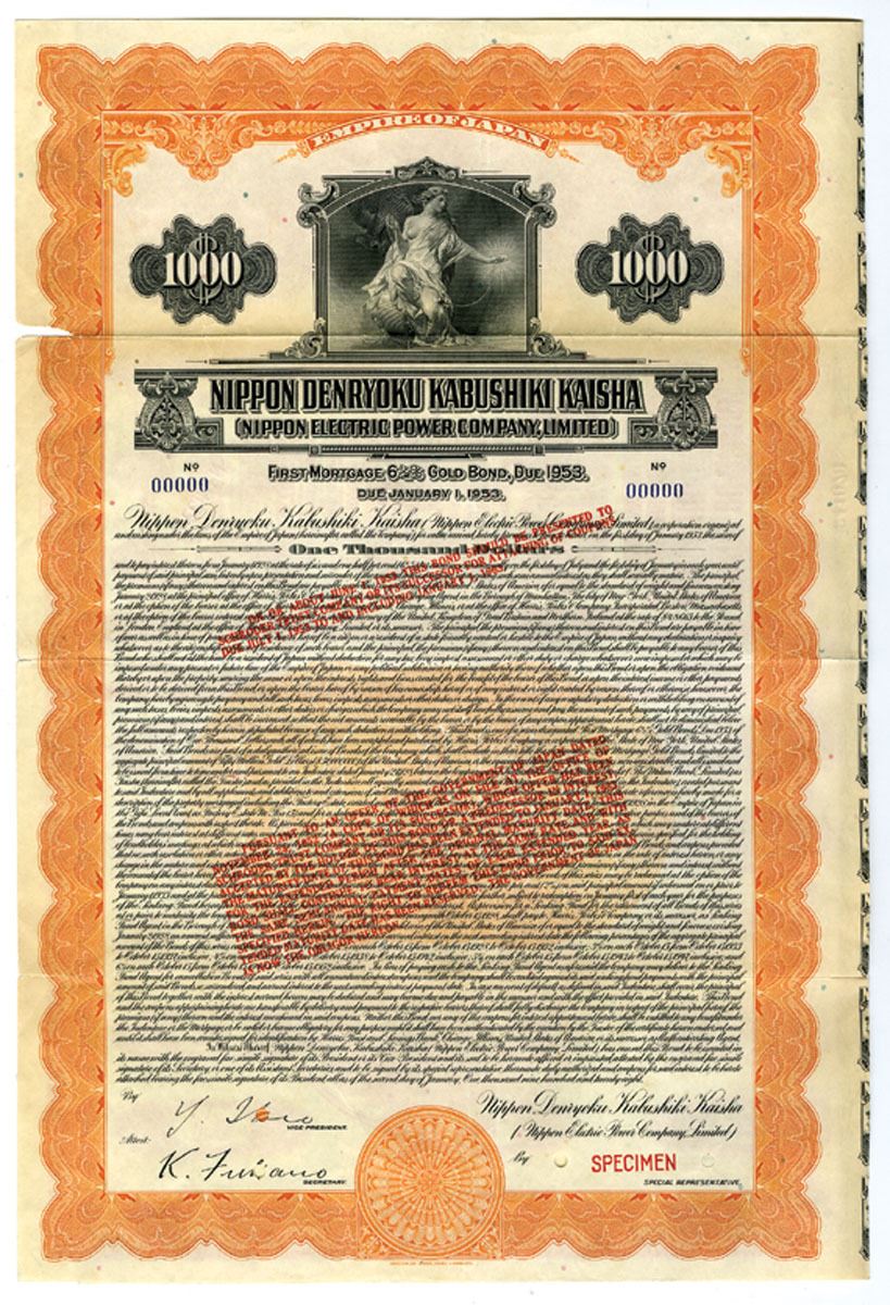 Japan, 1928. $1000 Specimen 6 1/2% First Mortgage Gold Coupon Bond, Black print with orange border and underprint, Allegorical woman wrapped in wires at top center, Specimen overprints and POCs, Fine to VF condition with missing piece from left hand margin, ABNC. This was the only example found in the ABNC archives in 2002 and the only one available.