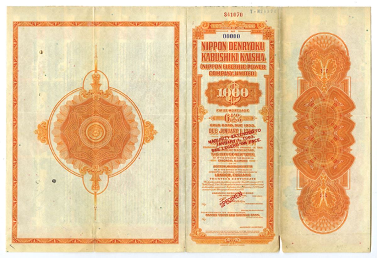 Japan, 1928. $1000 Specimen 6 1/2% First Mortgage Gold Coupon Bond, Black print with orange border and underprint, Allegorical woman wrapped in wires at top center, Specimen overprints and POCs, Fine to VF condition with missing piece from left hand margin, ABNC. This was the only example found in the ABNC archives in 2002 and the only one available.