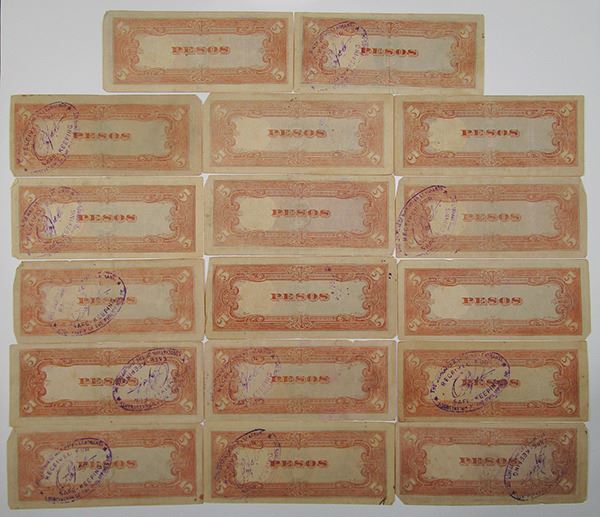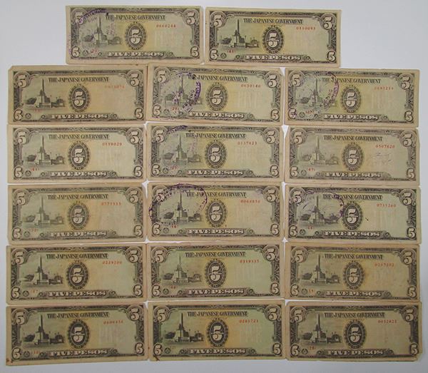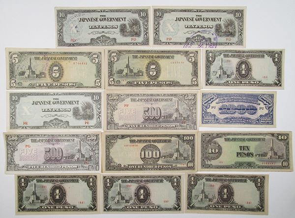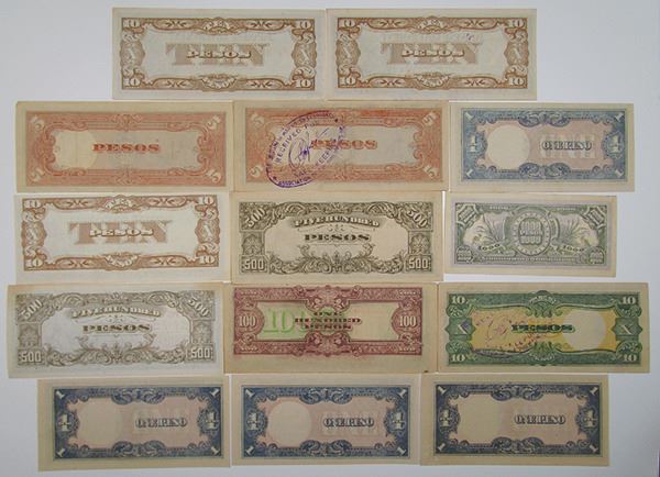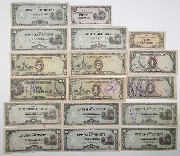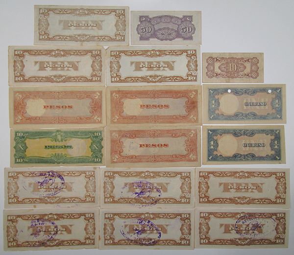 Philippines. Lot includes a large accumulation of 10 Centavos, 50 Centavos, 1 Peso, 5 Pesos, 10 Pesos, 100 Pesos, 500 Pesos, and 1000 Pesos, all from the Japanese Invasion Money issues. P-104; 105; 108 (12); 109 (6); 110 (20); 111 (2); 112; 114 (2); 115; and others. Generally Fine to XF. (48)