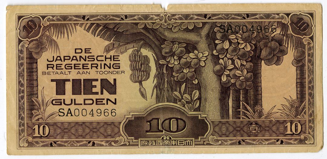Netherlands Indies - Japanese Occupation WWII. ND (1942). 10 Gulden, P-125a, Issued banknote, Purple on pale green underprint, with Dutch text, Low S/N SA004966. VG condition with small piece missing from top center.