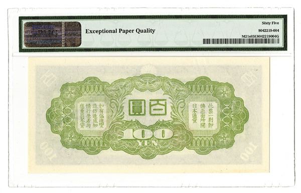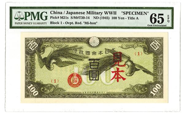China, 100 Yen, Title A, P-M21s, S/M#T30-14, Specimen, black on yellow-green underprint, red Mi-Hon overprint, No serial numbers, Block "1", PMG graded Gem Uncirculated 65 EPQ, rare as specimen.