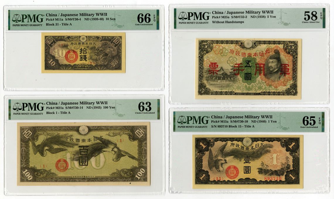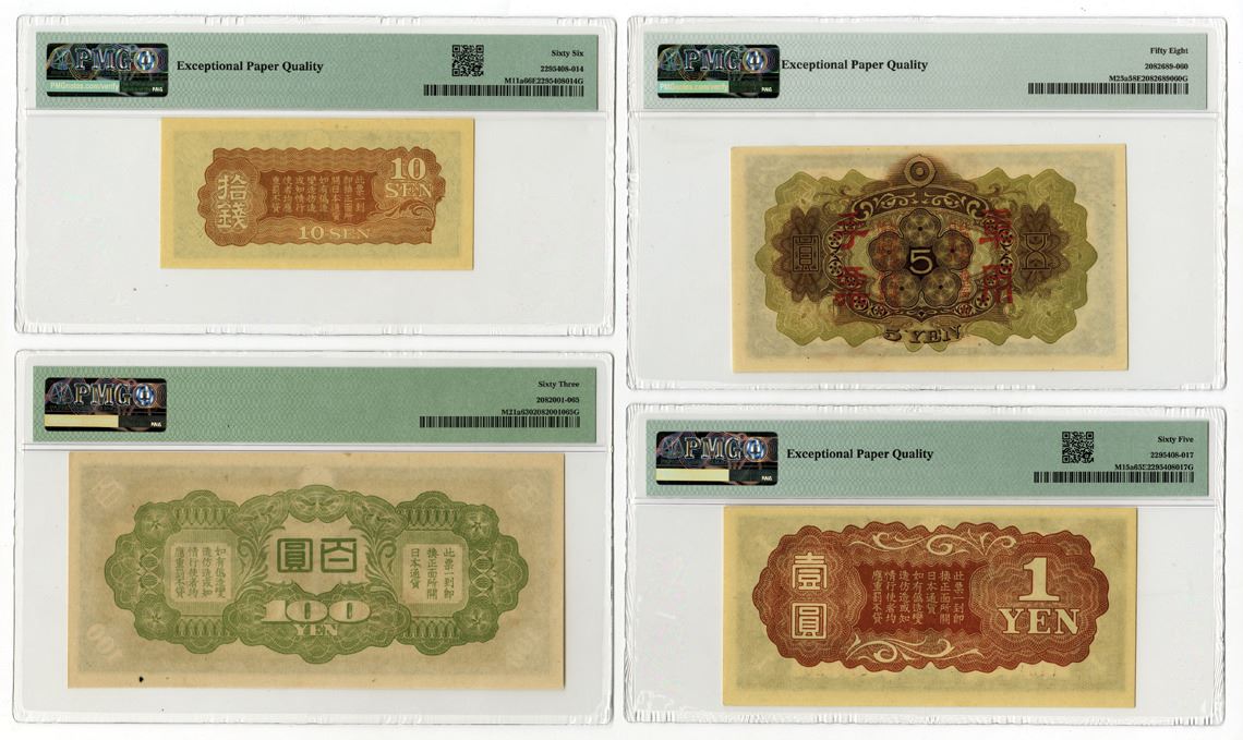 China, 1939 to 1945. Lot of 4 Issued Banknotes, Includes: 10 Sen, P-M11a S/M#T30-4, Block 31, ND (1939-40), PMG Gem Unc 66 EPQ; 1 Yen, P-M15a S/M#T30-10, S/N 893701 Block 15, ND (1940), PMG Gem Unc 65 EPQ; 100 Yen, P-M21a S/M#T30-14, Block 1, ND (1945), PMG Choice Unc 63; 5 Yen, P-M25a, S/M#T32-2, ND (1938), PMG Choice About Unc 58 EPQ. (4). Sold "AS IS" no returns accepted.
