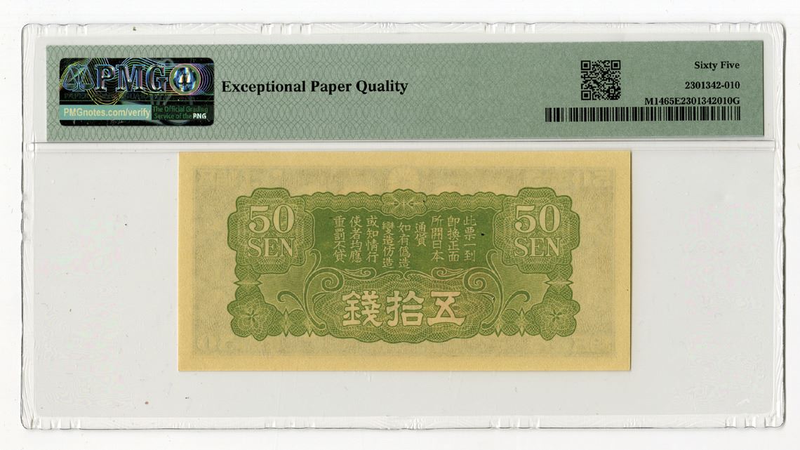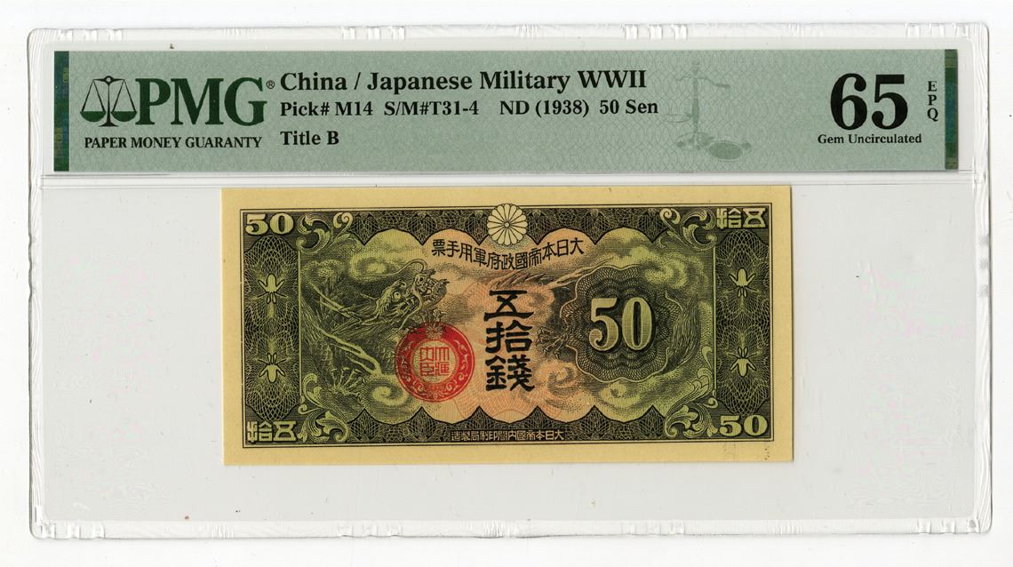China, ND (1938). 50 Sen, P-M14 S/M#T31-4, Issued Banknote, Black on red and green underprint with dragon at left, Back is pale green, Title B, PMG graded Gem Uncirculated 65 EPQ.