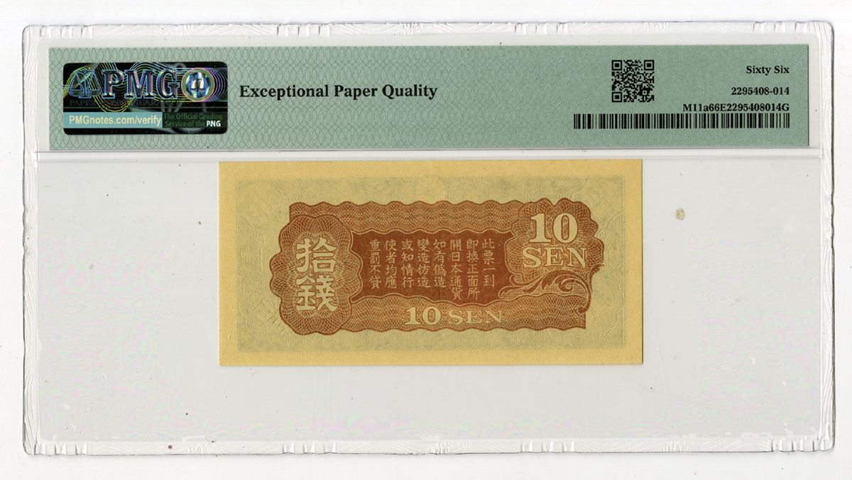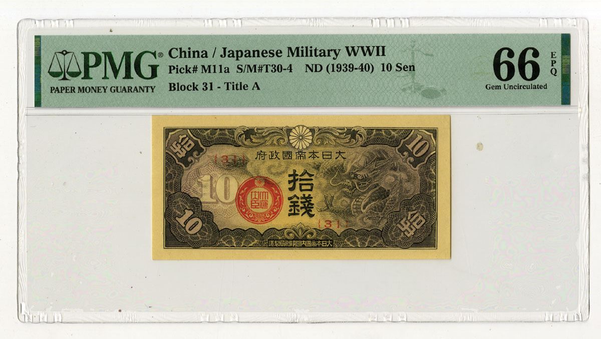 China, ND (1939-40). 10 Sen, P-M11a S/M#T30-4, Issued Banknote, Black on orange underprint with dragon at right, Block 31, Title A, PMG graded Gem Uncirculated 66 EPQ. Only 7 notes grade 1 increment higher out of 219 notes graded in the PMG census. Only 1 other note has been offered at auction at this level since 2014.