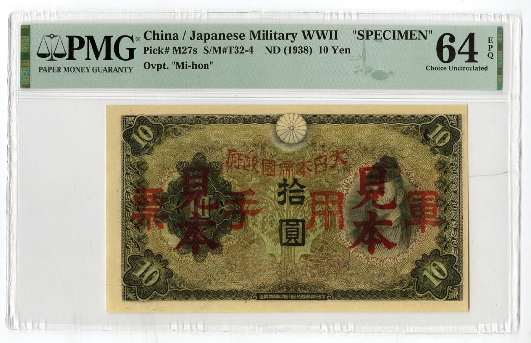 China/ Japanese Military, ND (1938). 10 Yen, P-M27s, S/M#T32-4, Specimen Banknote, Dark green on pale green and m/c underprint, Red "Mi-hon" overprint, PMG graded Choice Uncirculated 64 EPQ.
