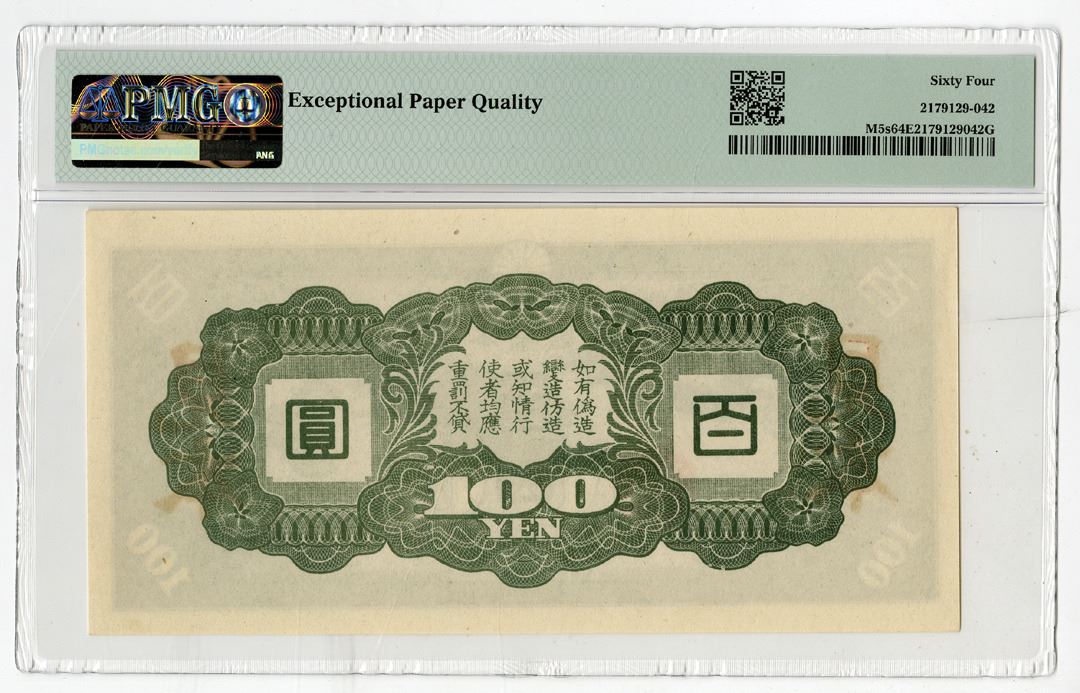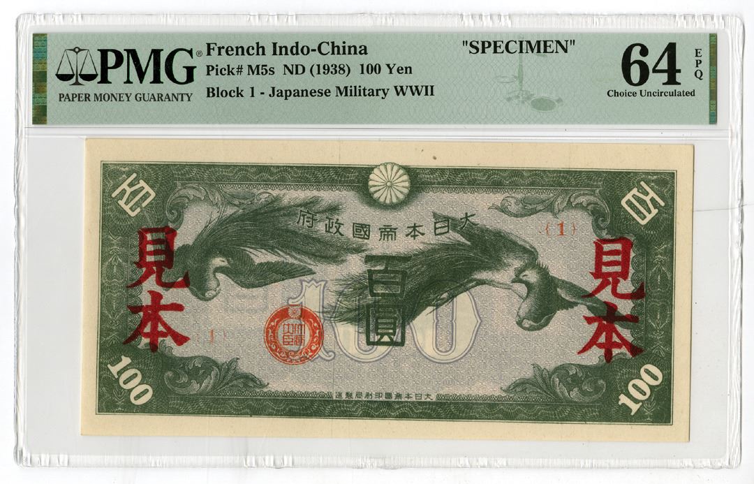 French Indo-China/Japanese Military, ND (1938). 100 Yen, P-M5s, Specimen Banknote, Blue-green on lilac underprint with Onagadori cockerel at left and right, Red specimen overprints, Block 1, PMG graded Choice Uncirculated 64 EPQ.