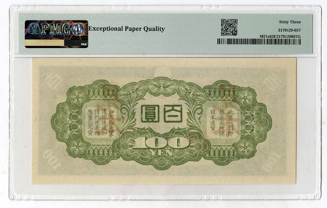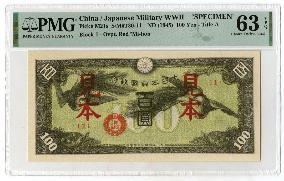 China/Japanese Military, ND (1945). 100 Yen, P-M21s, S/M#T30-14, Specimen Banknote, Black on yellow-green underprint with Onagadori cock at left and right, Block 1, Red "Mi-hon" overprint, PMG graded Choice Uncirculated 65 EPQ.