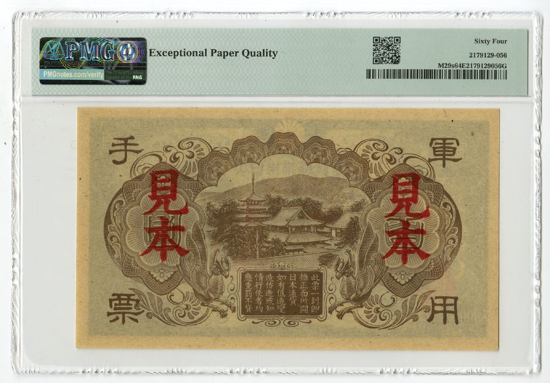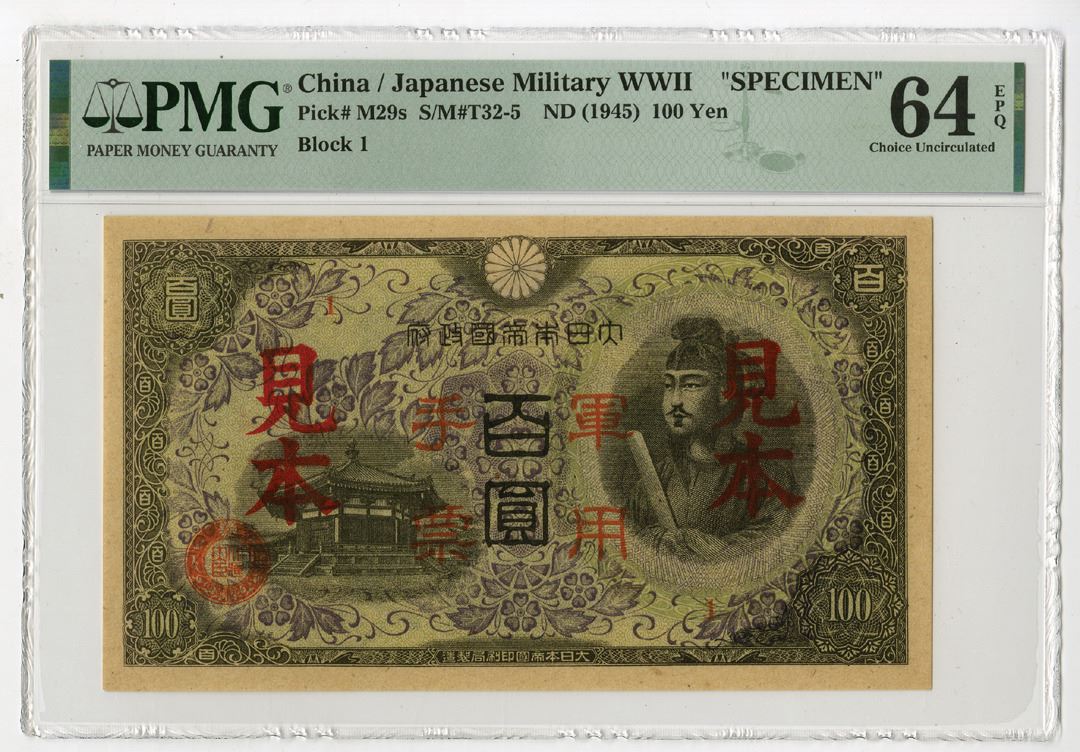 China/ Japanese Military, ND (1945). 100 Yen, P-M29s, S/M#T32-5, Specimen Banknote, Black on green and violet underprint, Red "Mi-hon" overprint, Black #1, PMG graded Choice Uncirculated 64 EPQ.
