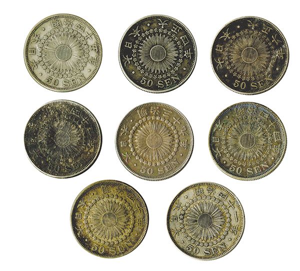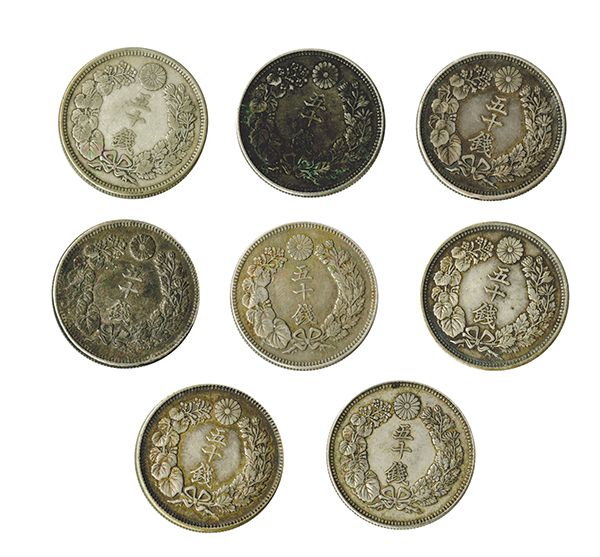 All different. Emperor Mutsuhito - Yr.40(1907); Yr.41(1908); Yr.42(1909); Yr.43(1910); Yr.44(1911); Yr.45(1912). Yoshito - Yr.4(1915); Yr.6(1917). Most are Extremely Fine or so; most with silvery gray natural toning. [8]