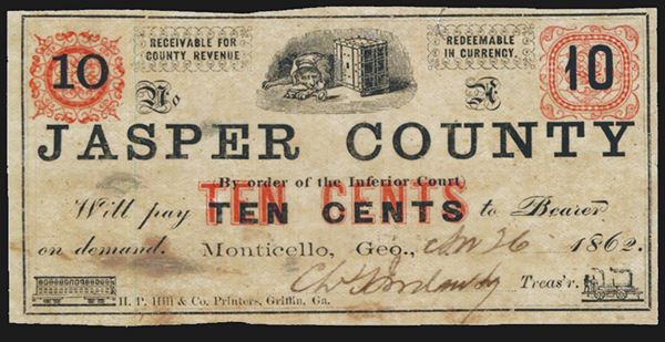 Monticello, Georgia, July 25th, 1862, 10 cents, Unlisted, Issued obsolete Banknote, Black on red underprint on thin and translucent onion skin type of paper, Dog resting with key in front of safe on top middle, small locomotive on LR and railroad car on LL, Signed but no Serial Number, repaired ink burn hole on the LL, otherwise note appears nice Choice AU to Uncirculated. Scarce note in this high grade. H.P. Hill & Co., Griffin, Ga.