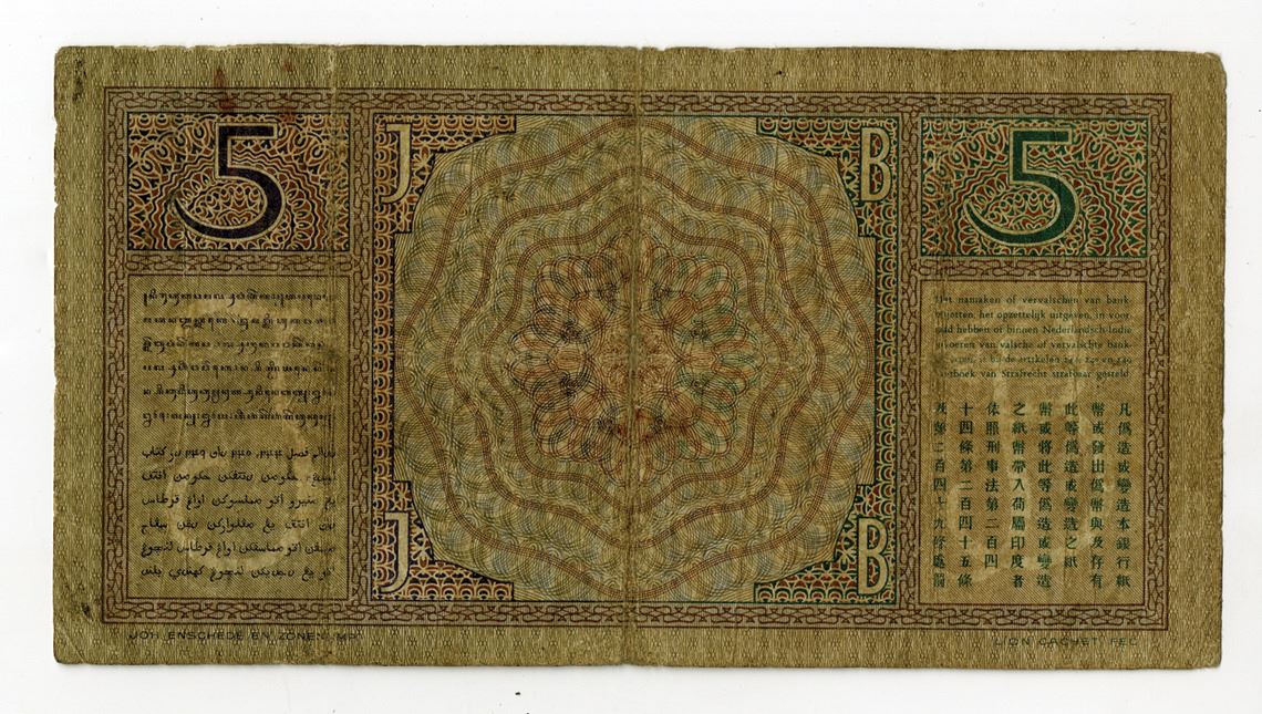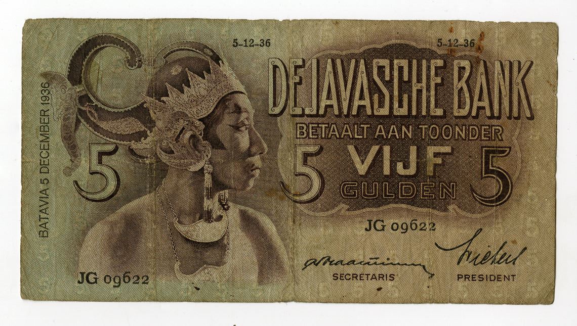 Netherlands Indies, 1936. 5 Gulden, P-78a, Issued Banknote, Brown on light brown and pale green underprint with Javanese dancer in traditional headdress at left, Back is m/c with text in four languages: Dutch, Javanese, Chinese, & Arabic, S/N JG09622, Fine condition with toning and staining, JEZ.