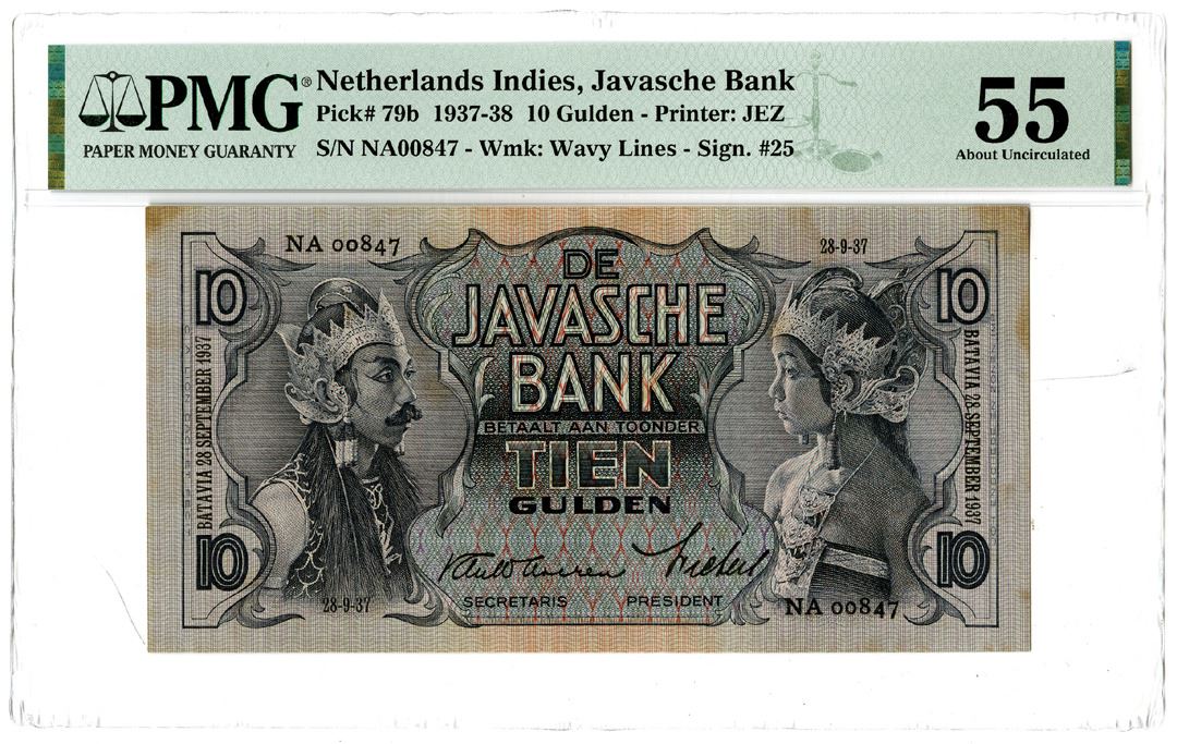 Netherlands Indies. 1937-38. 10 Gulden, P-79b, Issued Banknote. Dark blue on light blue and pink underprint with Javanese dancers at left and right. S/N NA00847 with watermark of wavy lines. PMG graded About Uncirculated 55 with comment "stains."