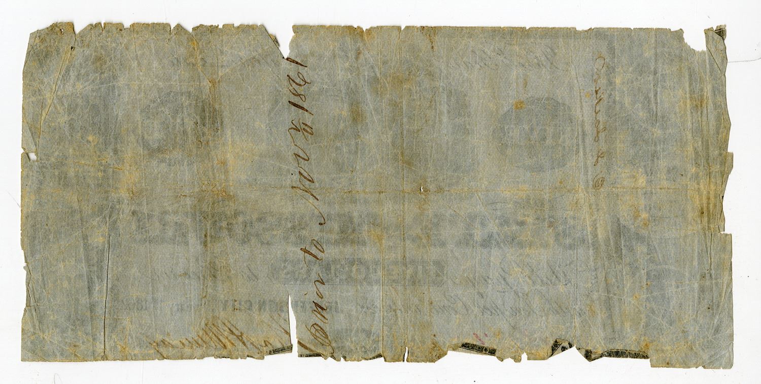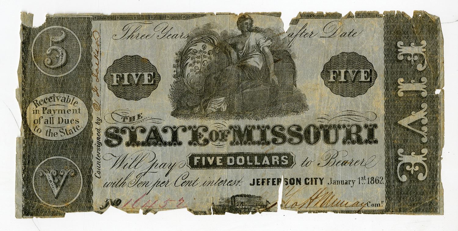 Jefferson City, Missouri. January 1, 1862, State of Missouri. $5, (Cr.6A), Issued obsolete scrip note, Act of October 28th, 1861, Allegorical Commerce seated on a bale of cotton at top center, Blue Tinted Paper without Engraver's Name, Blank back, S/N 16452, VG to Choice VG condition with rough edges and small edge tears, and toning, D. Weil. Eng. Rarity 6 in Criswell and Shull.