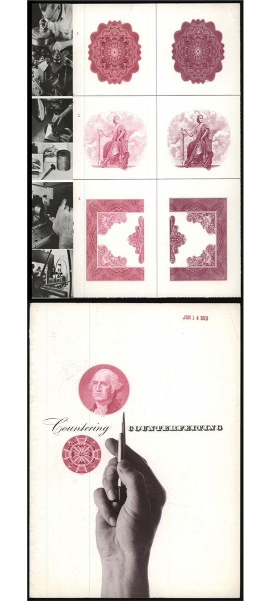 California, 1973, ÒCountering CounterfeitingÓ, Vignette of George Washington on cover with photograph of hand holding engraving instrument, Short manual on counterfeiting prevention taken by Jeffries BNC in black and pink print. VF-XF condition. Only 1 found in archives.