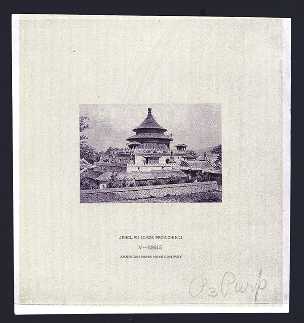 Szechuan, China, 1910-30, Proof engraving Building or temple printed in dark purple on india paper, 4 by 4 inches, bottom imprint has Jehol-Pu Lo Size Prov. Chihli - V-53615 - American Bank Note Company with archival pencil notation on bottom right, P3 Purple. Choice Uncirculated condition except for vertical fold from archival storage to the right of the design without touching it. Rare proof vignette and amazing miniature work of art. ABNC.