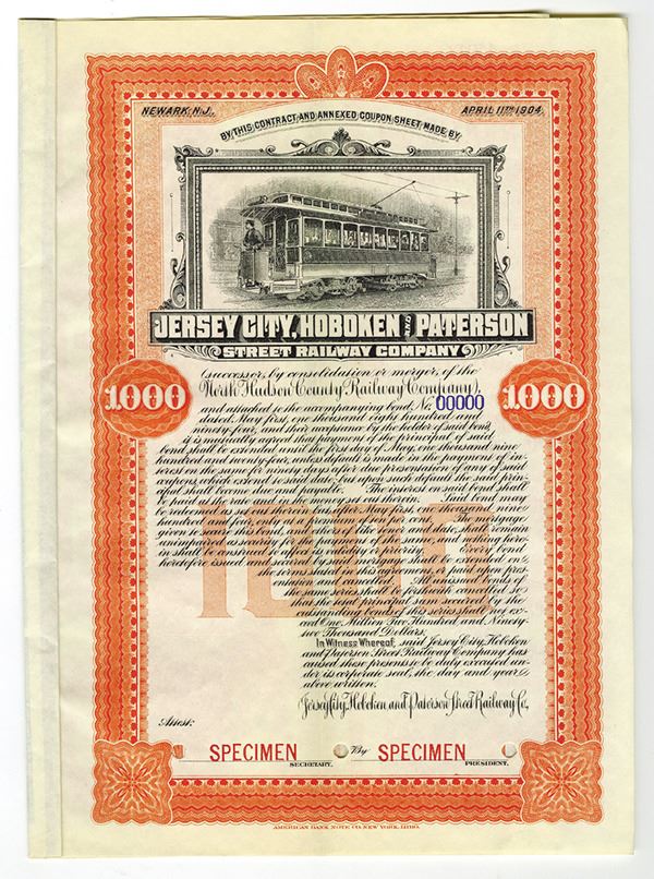 New Jersey. $1000 Specimen 5% Improvement Mortgage Coupon Bond, Black print on orange border and under tint, Street rail car at top, Specimen overprints and POC's, VF-XF condition, ABNC.