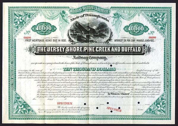 Pennsylvania. $10000 Specimen 6% 1st Mortgage Bond. Black print with ornate green border and under print. Vignette of mine and river at top center of certificate. POC's and red SPECIMEN overprints, VF condition, ABNC. Listed railroad and bond in Cox.