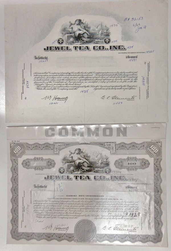 New York. Production Proof for 100 Shares Common Stock Certificate. Lot includes a photocopy of certificate with production notes in margin and print of text portion of certificate with more notations, Both are in VF-XF condition, S-CBNC.