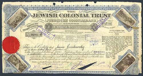 Israel, 1913, 1 Share, Issued Stock, Black on blue border and underprint, Vignettes of different Israeli scenes in each corner, F condition.