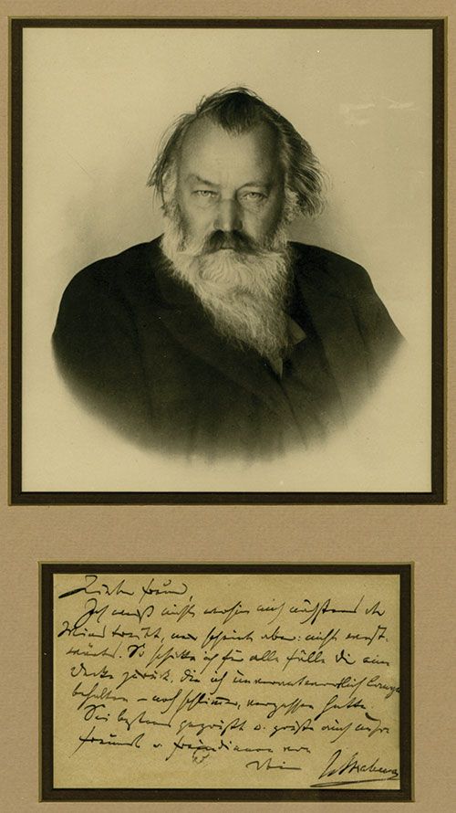 Postal card from Austria to Munich, Germany ND (ca.1870's) written entirely in German, 5.75 x 3.5 inches, also included as a photograph mounted under class and framed. Johannes Brahms, (1833 – 1897), was a German composer and pianist, and one of the leading musicians of the Romantic period. Born in Hamburg, Brahms spent much of his professional life in Vienna, Austria, where he was a leader of the musical scene. In his lifetime, A virtuoso pianist, he premiered many of his own works; he also worked with some of the leading performers of his time. Many of his works have become staples of the modern concert repertoire. Brahms, an uncompromising perfectionist, destroyed many of his works and left some of them unpublished.