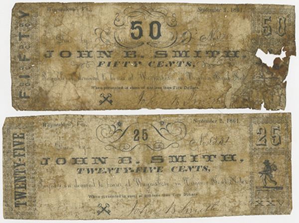 Waynesboro, VA. Lot of 2 notes includes 50 Cents and 25 Cents obsolete notes issued and signed by John B. Smith. The first Fair to Good; the second in VG condition both with staining. (2)