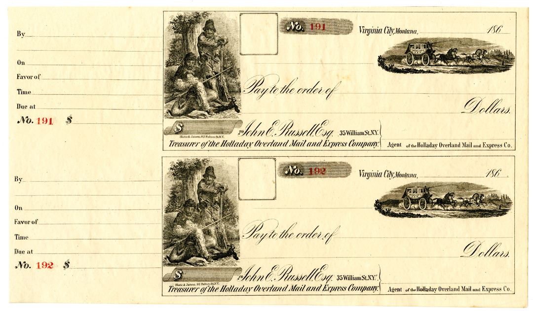 Virginia City, Montana, ca. 1860s. Uncut Check Pair payable to John E. Russell, Esq., the Treasurer of the Holladay Overland Mail and Express Company, a stage coach company, S/N's 191 and 192, Black text with black border, Hunters in woods at left, and Overland buggy pulled by horses at top right corners, Counterfoil attached. VF condition.