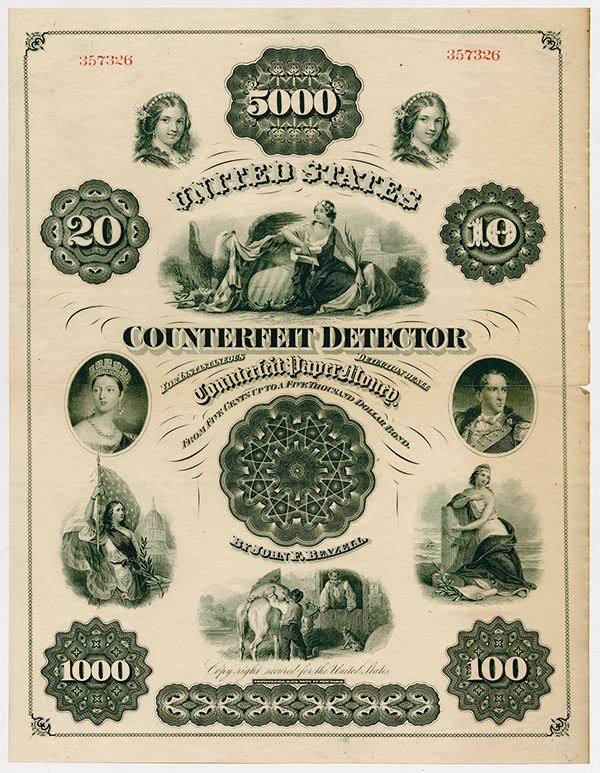 New York, NY, ND (ca.1860-70), Large format advertising sheet, 8.5 by 11.25 inches, black printed on white paper, Multiple vignettes including young women, men with horse and dog, Queen Victoria portrait, patriotic allegorical women and various text or numerical medallions, S/N 357326 on top left and right in red. folded horizontally once with small edge separation archivally reinforced, otherwise in VF to XF condition, Attractive and rare Continental BNC advertising sheet . CBNC. (ex. Auction #90, R.M. Smythe, NY Grand Sale 1990, Lot 1917) (Ex. John E. Herzog Collection)