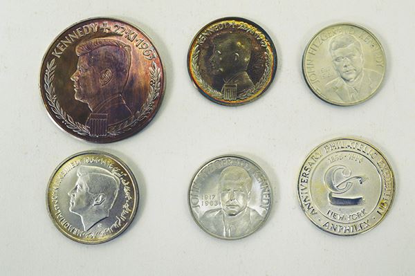 Sharjah 5 Rupees, 1964; 1 and 3 Argentus silver; Homage of the Nation Medals (2); Collector's Club of NY Silver medal, 1996. A bit over 5 ounces of silver. 6 pieces. Uncirculated, some proof like.