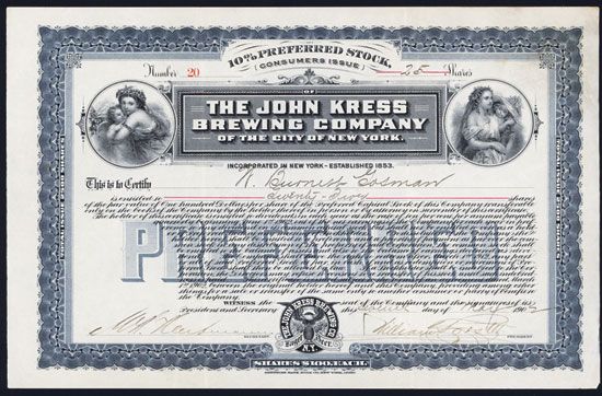New York, 1902, 25 Shares, Issued and Uncancelled Stock, #20, Black on blue border and underprint, Vignette of young girl holding baby top left and and top right, VF-XF condition, ABNC.