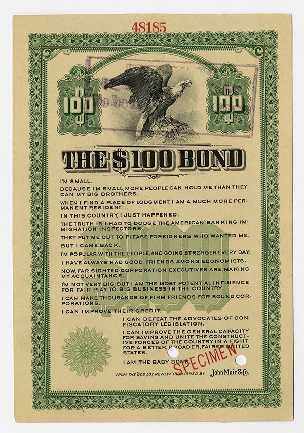 "The $100 Bond". Eagle on rock, nice green border. From ABNC archives, with a purple hand stamp, SPECIMEN overprint and POC. (From the collection of John E. Herzog)